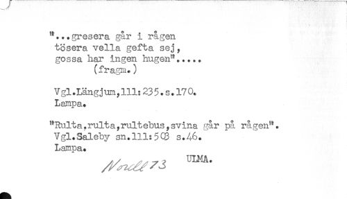 //// ..gresera går i rågen //// tösera vella gefta sej, //// gossa har ingen hugen**..... //// (fra^.) //// Vgl .Längjum,111:23 5. s. 17 0. //// Lampa. //// ^Rulta.rultayrultebusysvina går på rågen^. //// Vgl.Salebysn.lll:5C3s.46. //// Lampa. ////