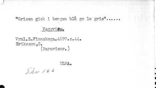 //// - - - - --- ' ' . . a //// "Grisen gick i bergen blå go lo gris"...... //// Vaggvisa. //// < //// Vrml. 3. Finnskoga. 4697. s. //// ErikssonyG. i //// (Barnvisor.) //// ! //// ULMA. ////