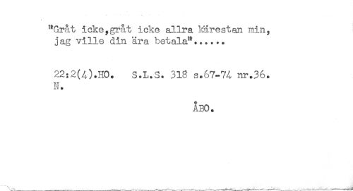 //// "Gråt icke,gråt icke allra kärestan min, //// jag ville din ära betala"...... //// 22:2(/J.H0. S.L.3. 318 S.67-7A nr.36. //// N. //// ÅBO. ////