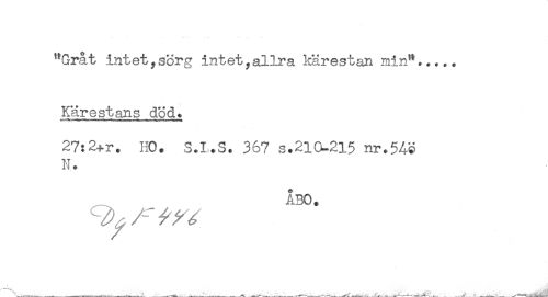 //// "Gråt intet,sorg intet,allra kärestan min"...,. //// Kärestans död. //// 27:2+r. HO. S.I.S. 367 s.210-215 nr.5Ac //// N. //// ÅBO. ////