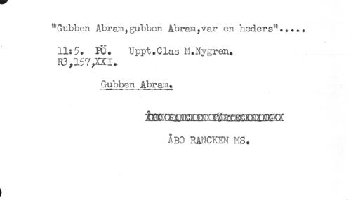 //// "Gubben Abram,gubben Abram,var en heders"..... //// 11:5. FÖ. Uppt.Clas M.Nygren. //// R3,157^X1. //// Gubben Abram. //// ÅBO RANCKEN MS. ////