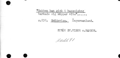 //// "Gubben han gick i hasselskoa //// barkade sig käppar vita"...... //// * //// S.232. Siaädevisa. Ångermanland. //// STI^M SV.VISOR o.RAMSOR. ////