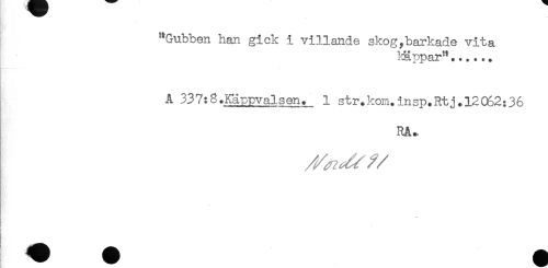 //// "Gubben han gick i villande skog,barkade vita //// käppar"...... //// A 337:8.Käppvalsen. 1 str.kom.insp.Rtj.12062:36 //// RA. //// * ////