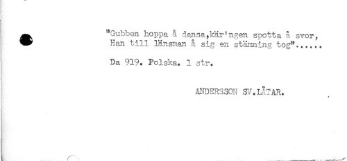 //// ^ "Gubben hoppa å dansa,käringen spotta å svor, //// * Han till länsman å sig en stämning tog"-..... //// Da 919. Polska. 1 str. //// ANDERSSON SV.LÅTAR. //// * //// * ////