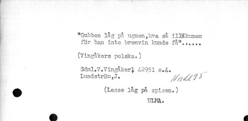 //// ; //// ! "Gubben låg på ugnen,hva så illälmmen //// ^ för han inte brenvin kunde få".,.... //// (Vingåkers polska.) //// Sdml.V.Vingåker^ 42951 s.4. //// Lundström,-!. //// (Lasse låg på spisen.) //// ULHA. ////
