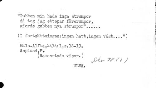 //// < //// ..*.... t - . . ^ . ) //// "Gubben min hade inga strumpor //// då tog jag ettepar fårerumpor, //// gjorde gubben nya strumpor"...... ^ //// (I fortsättningen:ingen hatt,ingen väst....") ' //// Häls.Alfta,2434:1,s.18-19. ! //// Asplund,?^ ! //// (Ramsartade visor.) //// UIMA. ////