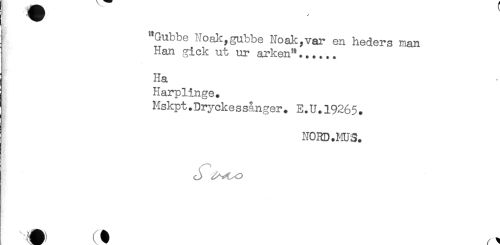 //// j "Gubbe Noak,gubbe Noak,var en heders man //// ] Han gick ut ur arken"...... //// { Ha //// Harplinge. //// Mskpt.Dryckessånger. E.U.19265. //// NORD.MUS. ////