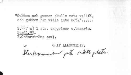 //// "Gubben och gumman skulle mota vallfä, //// och gubben han ville inte mota"...... //// ! //// S.227 a) 1 str. vaggvisor o.barnrim. ^ //// Nordl.93. //// E.Cederströms sam^. //// ^ GRIP Am-IOGELW. ////