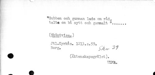 //// j "Gubben och gumman lade om råd, //// j talte om bå nytt och gammalt //// (Skämtvisa.) //// Jtl.Kyrkås. 1213.s.59. //// Borg. ^ ^ ^ //// ^ (Aktenskapsgrälet). ////