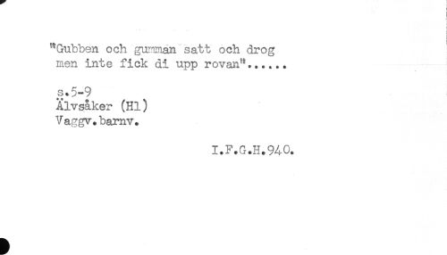 //// ' ) //// i //// ! //// < //// < //// i //// ) //// "Gubben och guriman satt och årog //// men inte fick di upp rovan"...... //// s.5-9 //// Älvsåker (Hl) //// Vaggv.bamv. //// I.F.G.H.9A0. ////