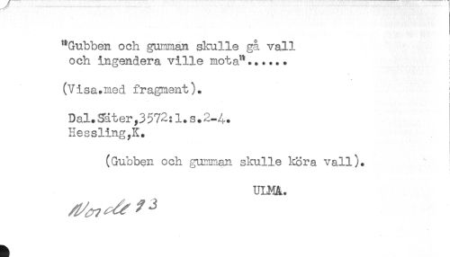 //// "Gubben och gumman skulle gå vall //// och ingendera ville mota"...... //// (Visa.med fragment). i //// . //// Dal.Säter,3572:1.S.2-A. //// HesslingyK. //// (Gubben och gumman skulle kora vall). //// ULMA. ////