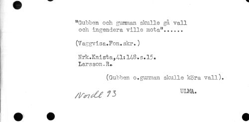 //// "Gubben och gunman skulle gå vall //// och ingendera ville mota"...... //// (V aggvisa.Fon.skr.) //// Nrk.Knista,41:H8.s.l5. //// Larsson.R. //// (Gubben o.gumman skulle köra vall). ////