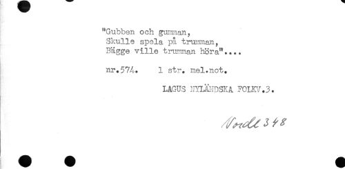 //// "Gubben och gumman, //// Skulle spela på truinman, //// Bägge ville trumman höra".... //// nr.574. 1 str. mel.not. //// LAGUS NYLÄNDSKA F0LKV.3. ////
