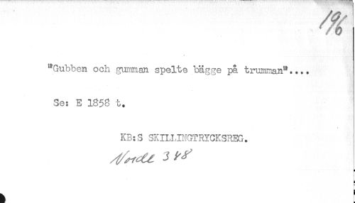 //// / ! //// "Gubben och gumman spelte bägge på trumman".... //// Se: E 1858 t. //// * //// KB:S SKILLINGTRYCKSREG. //// t ////