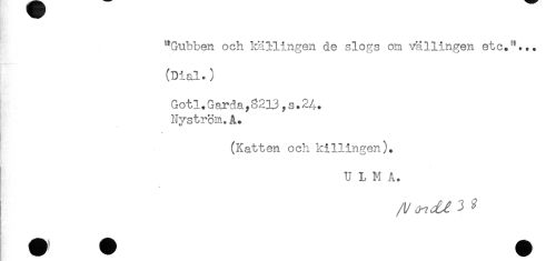 //// P' ''' //// "Gubben och källingen de slogs os vällingen etc.".. //// (Dial.) //// Gotl.Garda,8233,s.24. //// Nyström.A. //// (Katten och killingen). //// U L M A. ////