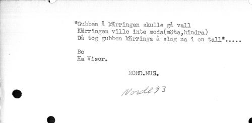 //// Ks' - ' ' //// ^Gubben å kärringen skulle gå vall //// Kärringen ville inte moda(m3ta,hindra) //// Då tog gubben kärringa å slog na i en tall*..... //// Bo //// * //// Ha Visor. //// NORD.MUSt ////