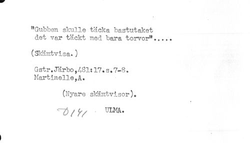 //// "Gubben skulle täcka bastutaket //// det var täckt med bara torvor"..... //// (Skämtvisa.) //// G str.Järbo,431:17.s.7-8. //// Martinelle,Å. //// (Nyare skämtvisor). //// '"Y) / UIKA. //// ) ////