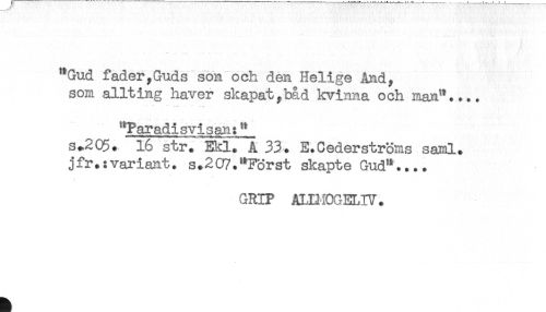 //// "Gud fader,Guds son och den Helige And, //// som allting haver skapat,båd kvinna och man".... //// -t - ^ *<* //// "Paradisvisaii:"_ //// 16 str.^Ekl. A 33. E.Cederströms saml. //// jfr.:variant, s.2 07. "Först skapte Gud".... //// / //// GRIP ALD10GELIV. ////