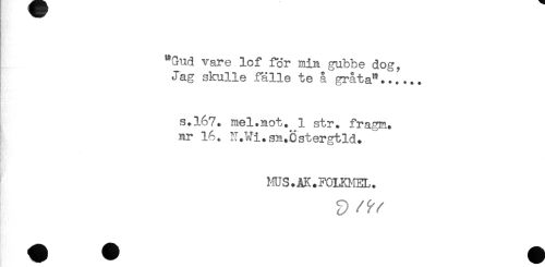//// "Gud vare lof för min gubbe dog, //// Jag skulle fälle te å gråta"..'____ //// s.167. mel.not. 1 str. fragm. //// nr 16. N.Wi.sn.Cstergtld. //// MUS.ÅK.FOLKMEL. ////