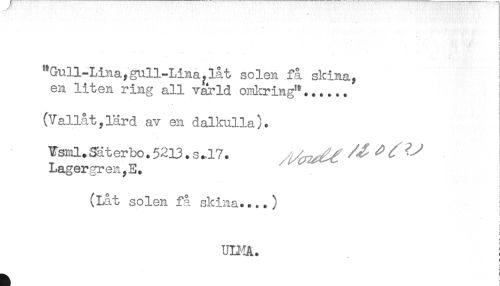 //// j //// ! //// "Gull-Lina,gul!-Lina^låt solen få skina, i //// en liten ring all värld omkring"...... I //// - //// . //// (Vallat,lärd av en dalkulla). //// Lagergren,E. //// ' //// (Låt solen få skina....) //// UUIA. ! //// : //// t- ////