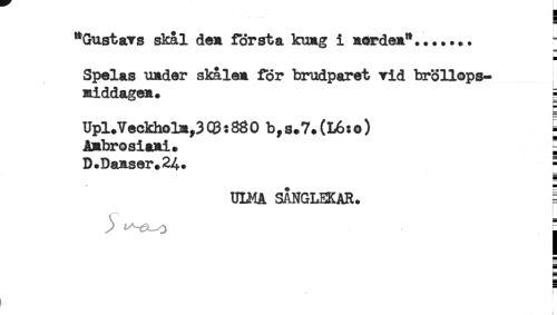 //// ............E //// "Gustavs skål den första kung i nardea*....... //// j //// * //// Spelas under skålen för brudparet vid bröllops- //// middagen. - //// r* //// Upl.Veckholm,303:880 b,s.7.(L6:o) E //// Ambrosiami. j //// D.DaH.ser.24. ! //// ULMA SANGLEKAR. ! //// ) j //// 5 //// E ////