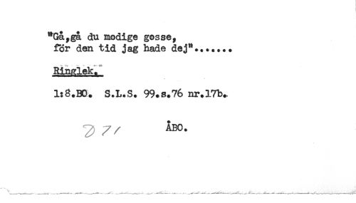 //// "Gå,gå du modige gosse, //// för den tid jag hade dej"....... //// -'-i- SSL- --. -:- - .*:---28r //// Ringlek. //// 1:8.BO. S.L.S. 99.3.76 nr. 17b.. //// / , ABO. ////