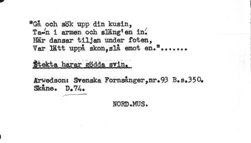 //// "Gå och sök upp din kusin, //// Ta-n i armen och slang* en in^ //// Här dansar tiljan under foten, //// Var Tätt uppå skon,slå emot en*".....*. I //// Arwedson: Svenska Fomsånger,nr*93 B.s.350. //// Skåne. D.7A+ //// NORD .MUS. ////