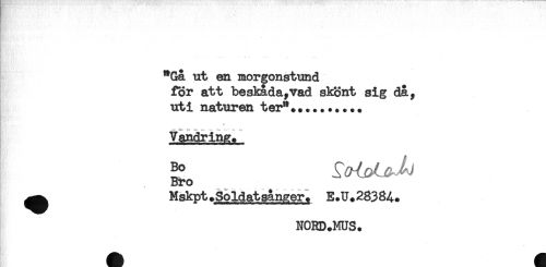 //// "Gå ut en morgonstund //// for att beskåda,vad skönt sig då, //// uti naturen ter"*......... //// .. //// * //// ^ t-'' -i' '--- *' ' ; * s: //// Vandring. //// Bro //// ^^ Mskpt. Soldat sånaer. E.U.28384. //// NORB.MUS. ////