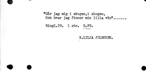 //// "Går jag mig i skogen,i skogen. //// Och hvar jag finner min lilla vän"....... //// Ringl.39. 1 str. D.89. //// N.LILJA JULBOKEN. ////