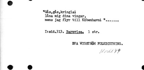 //// - //// "Gås,gåsykringlat //// låna mig dina vingar, //// mens jag flyr till Kobenhavnt //// < //// I;sid.313. Barnvisa. 1 str. //// EVA WIGST56M FOLKDIKTNING. ////