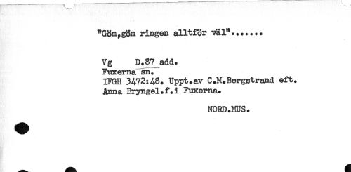 //// "Göm,göm ringen alltför väl"....... //// Vg D.87 add. //// Fuxema sn. //// IFGH 3A72:4%. Uppt.av C.M.Bergstrand eft. //// Anna Bryngel.f.i Fuxema. //// NORD.MUS. ////