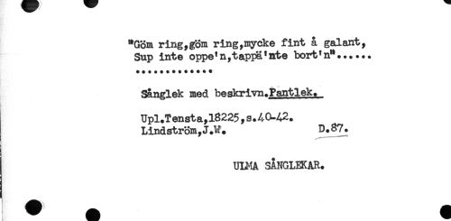 //// "Göm ring,göm ring,mycke fint å galant, //// Sup inte oppe'n,tappa'a.te bort*n".. + ... //// Sånglek med beskrivn.Pantlek. //// Upl.Tensta,l8225yS.4C^42. //// Lindström,J.W. D.87. //// Ul^IA SANGLEKAR. //// ^^ ^^ ^ A H ////