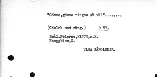 //// "Ggmma,gömma ringen så väl"........ //// (Gomlek med sång.) D 87. //// Smål.Pelame,21572, s. 2+ //// Haeggblom,C. //// ULMA SANGLEKAR. ////