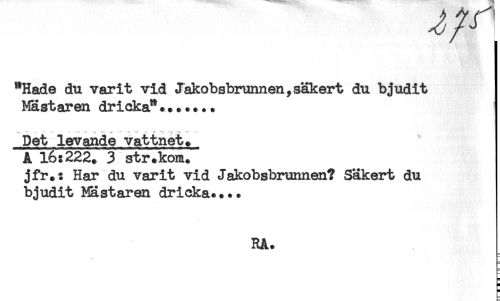 //// "Hade du varit vid Jakobsbrunnen, säkert du bjudit //// Mästaren dricka"*...... //// Det levande vattnet. //// A 16:222. 3 str.kom. //// jfr.: Har du varit vid Jakobsbrunnen? Säkert du //// bjudit Mästaren dricka.... //// RA. //// H ////