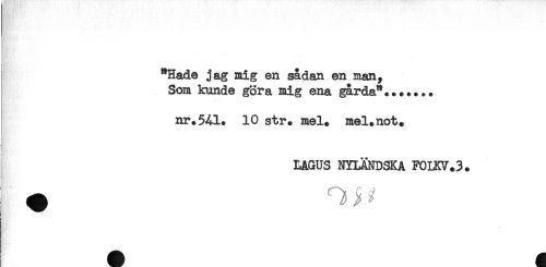 //// * //// "Hade jag mig en sådan en man. //// Som kunde göra mig ena gårda"....... //// nr. 541. 10 str. mel. mel. not. //// LAGUS NYLANDSKA F0LKV.3. ////