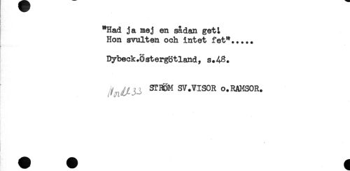 //// *Had ja mej en sådan get; //// Hon svulten och intet fet*..... //// f * * //// Dybeck.Östergötland, s.48. //// STBÖiM SV .VISOR o. RAMSOR. ////