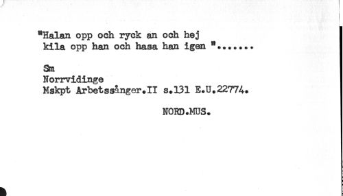 //// - //// "Halan opp och ryck an och hej //// kila opp han och hasa han igen "....... //// Sm //// Norrvidinge //// Mskpt Arbetssånger.II s.131 E.U.227%. //// NORD .MUS. ////