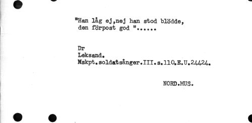 //// "Han låg ej,nej han stod blödde, //// den forpost god "...... //// Dr //// Leksand. //// Mskpt. soldatsånger.III. s+llO+E.U.24424. //// NORD.MUS. ////