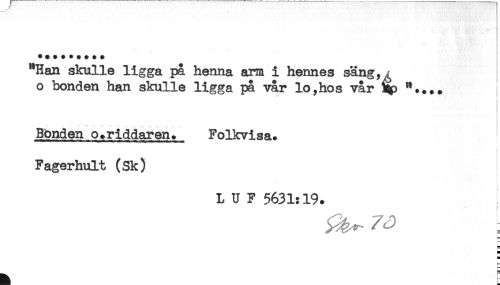 //// ********* //// "Han skulle ligga på henna arm i hennes säng,, //// o bonden han skulle ligga på vår lo,hos vår ^ ".+.. ; //// Bbnden o*riddaren* Folkvisa* //// Fagerhult (Sk) //// L U F 5631:19. //// ^ //// F ////