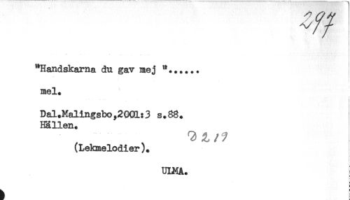 //// . . - - .. //// "Handskarna du gav mej //// mel. //// Dal.Malingsbo,2(XR:3 s.88. //// Hallen. //// (Lekmelodier). //// t //// F //// h ////
