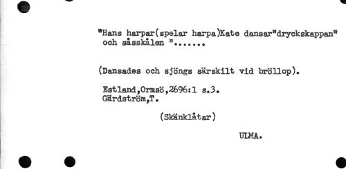 //// "Hans harpar( spelar harpa )Kate dansar "dryckskappan" //// och såsskålen "....... //// (Dansades och sjöngs särskilt vid bröllop). //// EstlandyOrmsö,2696:1 s.3. //// GärdströmyT. //// (Skänklåtar) //// UIMA. ////