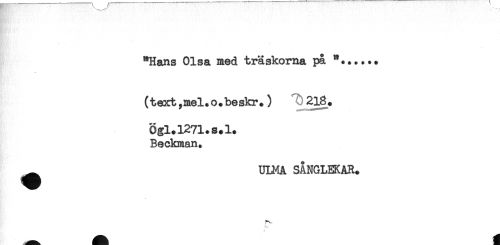 //// - //// '. - ' //// "Hans Olsa med träskorna pa //// (text,mel*o.beskr.) 218. //// Ogl.l271.s.l. //// Beckman. //// ^ ULMA SÅNGLEKAR. ////