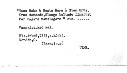 //// "Hans Rake å Bente Bure å Stem Krus, //// Krus dansade,Slange bultade fingfus, //// Per bagare manslagare " etc. ...... //// V aggvisa. med mel. //// Hls.Årbrå,7858,s*2A-25. //// Nordén,0. //// (Barnvisor) //// ULMA. ////