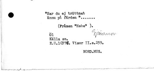 //// ^ "Har du ej tröttnat //// ^^ ännu på färden **....... //// (Pråmen "Hebe" ). //// i //// Källa sn+ //// E.U.1Q37& Visor II.s.259. //// [ NORD .MUS. //// !. ////