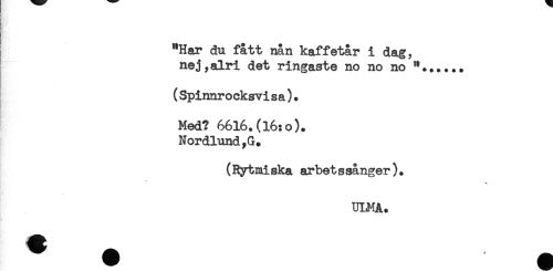 //// "Har du fått nån kaffetår i dag, //// nej,alri det ringaste no no no //// (Spinnrocksvi sa). //// Med? 6616.(16:o). //// Nordlund,G. //// (Rytmiska arbetssånger). //// ULMA. ////