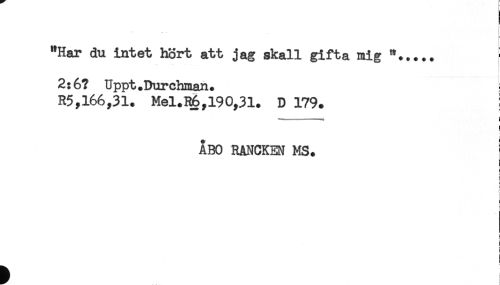 //// "Har du intet hört att jag skall gifta mig "..........< //// 2:6? Uppt.Durchman. //// R5,166,31. Mel.R6,190,31. D 179. //// } //// ÅBO RANCKEN MS. //// < //// i //// i //// i //// ! ////