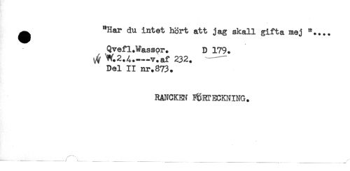 //// ^ "Har du intet hört att jag skall gifta mej //// Qvefl.Wassor. D 179. //// ^ W.2.A.-v.af 232. - //// Del II nr.873. //// RANCKEN FÖRTECKNING. //// - - - - , _ _ _ __ __ ____ ____ _ _______ ////