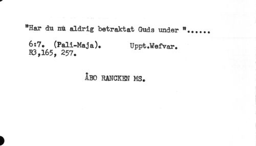 //// "Har du nu aldrig betraktat Guds under "...... //// 6:7. (Pali-Maja). Uppt.Wefvar. //// R3,165, 257. //// ÅBO RANCKEM MS. ////