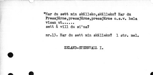 //// "Har du sett min skälleko, skälleko? Har du //// Pressjärne,pressjämeypressjäme o.s.v. hela //// visan ut...... //// sett å vill du si'na? //// nr.13. Har du sett min skälleko? 1 str. mel. //// ZELAND-STEHNVÄIL 1. ////