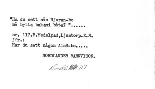 //// i //// : //// "Ha du sett nan Njur an-bo //// nå bytta bakani båta? //// 5 //// nr. 117.B.Medelpad.Ljustorp.E.S. //// jfr.: ; //// Har du sett någon AlnS-bo..... i //// NORDLANDER BARNVISOR. i //// a //// i //// i //// r ////